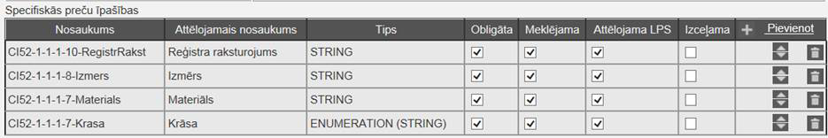 Tiek attēlots saraksts ar iepriekš preču veidam pievienotajām specifiskajām preču īpašībām.