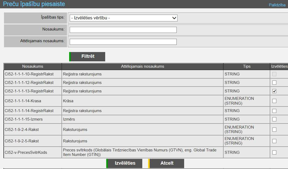 • Izvēlēties – kā pazīmes rūtiņa, kuru atzīmējot, izvēlētā preču īpašība tiek izvēlēta piesaistei preču veidam.
