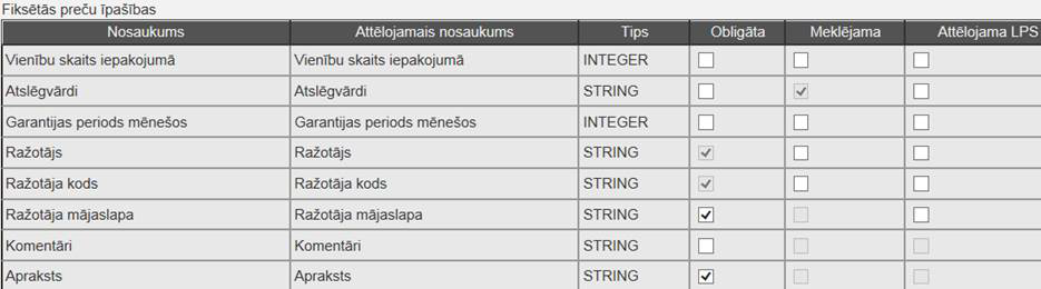Piezīme! Fiksētās preču īpašības tiek attēlotas tādā kārtībā, kā tās definētas sistēmā un to secību sarakstā nav iespējams mainīt.