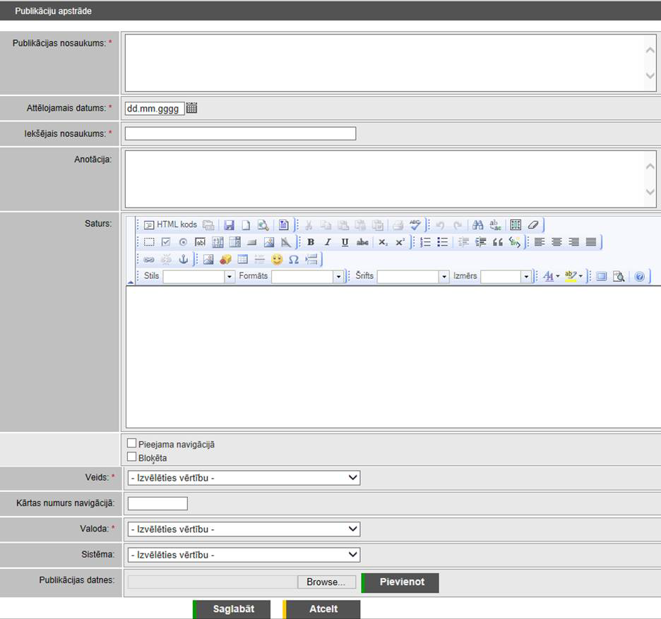 Piezīme! Ja publikācijai ir atzīmēta pazīme ‘Paziņojums’, tad ievadlauks nevar būt aizpildīts.