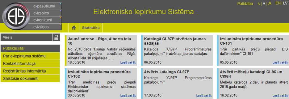 • E-konkursi – uzklikšķinot tiek atvērta e-konkursu apakšsistēmas sākumlapa.