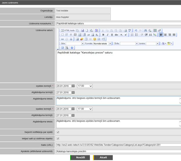 •Saņemt notifikāciju par izpildi – izvēles rūtiņu atzīmē, lai uzdevuma uzdevējam sistēma nosūtītu paziņojumu, kad uzdevums tiks izpildīts vai noraidīts;