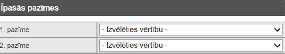 Vispārīgās vienošanās pozīcijai var norādīt vienu vai divas īpašās pazīmes, kas raksturo tajā ievietotās preces. Šādas pazīmes var būt pievienotas katalogam, visa līmeņa kategorijām un VV pozīcijām. Sistēmā nav paredzēta pārbaude par katalogiem, kategorijām un VV pozīcijām norādīto pazīmju savstarpējo atbilstību. T.i. kategorijai var norādīt vienas pazīmes, bet tajā esošai VV pozīcijai – citas. Īpašās pazīmes tiek uzturētas sistēmas klasifikatoros.
