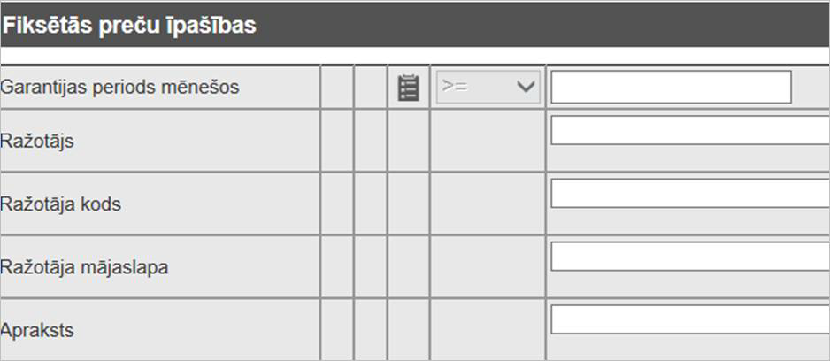• Garantijas periods mēnešos – norāda garantijas periodu izmantojot izvēles sarakstu ar salīdzināšanas zīmēm;