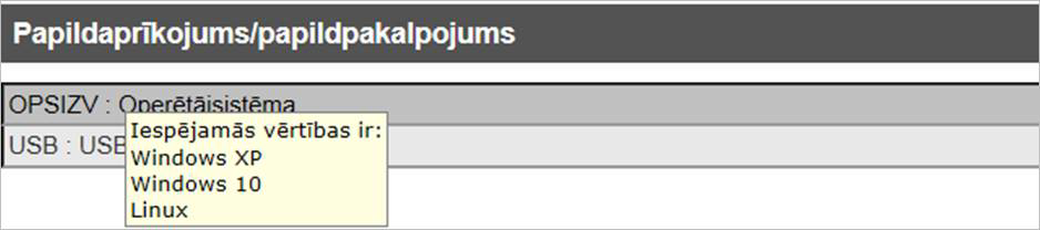 Pozicionējot peles kursoru uz īpašības ar tipu „papildaprīkojums ar izvēli” attēlojamā nosaukuma, tiek attēlota uzvedne ar papildaprīkojuma izvēles variantiem. Pieļaujamās vērtības tiek sakārtotas pēc kārtas numura, kas norādīts atbilstošās preces īpašības vērtību sarakstā.