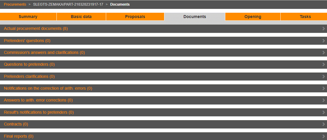 In the procurement and proposal section „Documents” documents related to procurement, complaints, pretenders’ questions and customer answers are maintained.