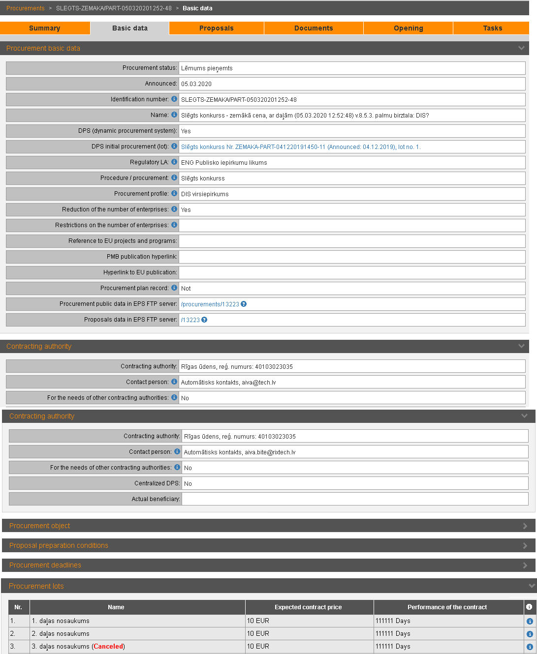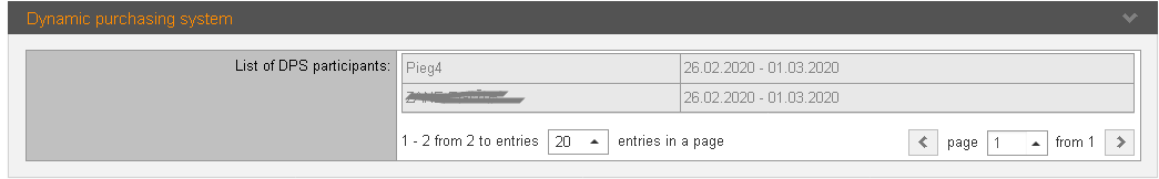 List of admitted DPS participants and period of their DPS membership. During the period members may submit their proposals to the procurements under DPS. Block is available in the initial procurement’s lot form or in the initial procurement base date form (if there aren’t lots in the procurement) only when DPS is in the status of ‘Established DPS’. |