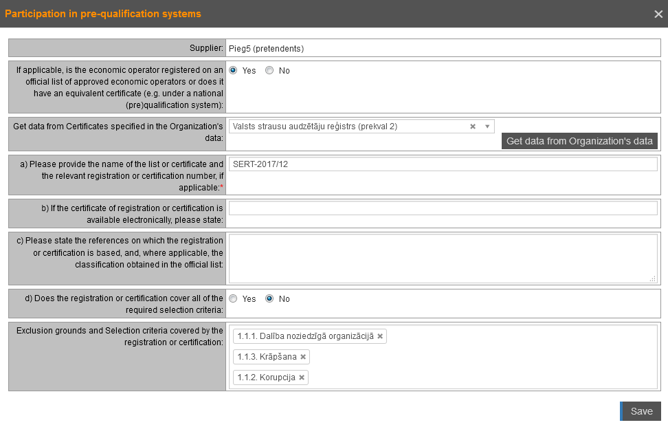 Certificate information can be entered manually or downloaded from EPS registered data by clicking the button Get data from Organization’s data. If the certificate details are changed in the organization's data, the information in the proposal does not change automatically.
