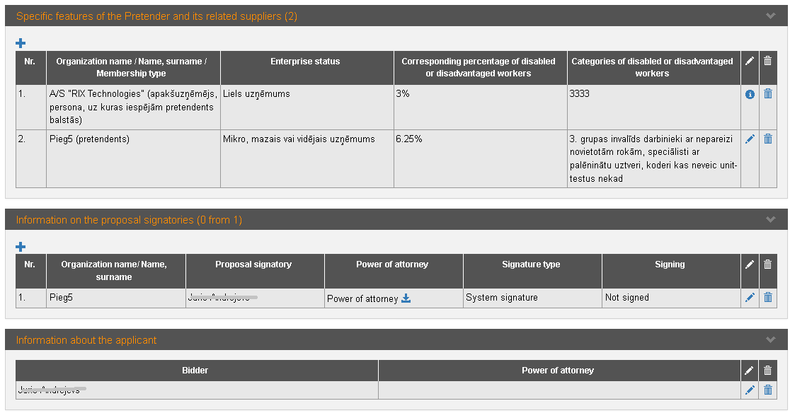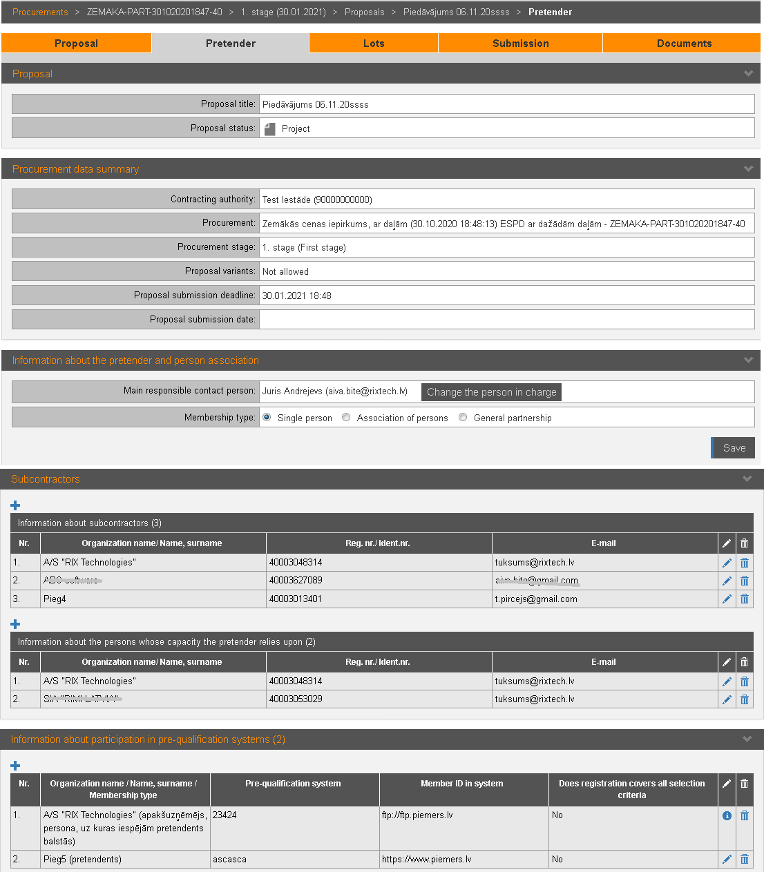 Information about pretender, subcontractors, signatories and submitter of the proposal is maintained in the proposal’s section „Pretender”: