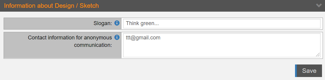 When creating a proposal for Design contest, in the Slogan field enter the text that doesn’t allow to identify the applicant. The slogan will be visible to the customer after the opening of the proposals. In the field Contact information for anonymous communication enter contact information (mandatory - e-mail) for anonymous communication, which Contracting authority will be able to use for communication with the applicant. The contact details must be in a way by which the applicant cannot be identified. Save the information entered in the block. Click an |