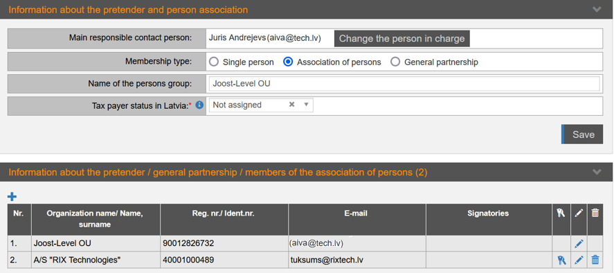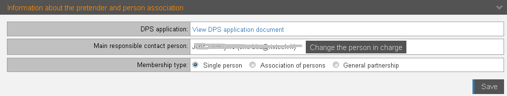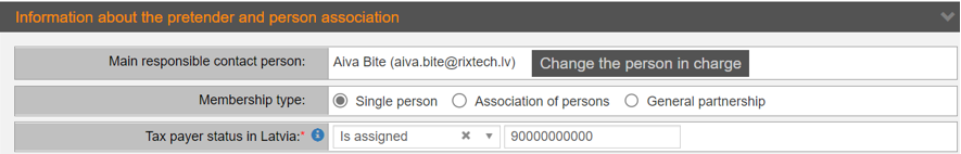 You can specify one person in charge for each proposal. This information is available to Procurement commission. To change persons in charge, click the button Change the person in charge (see 15.6.3 Change the main responsible person). This person receives notifications related to the procurement. If there are association of the persons, select Membership type, write the name of the association and save the information. To open the DPS allocation, click the link in the field DPS application. Foreign pretenders must provide information about the tax payer number assigned in Latvia. |