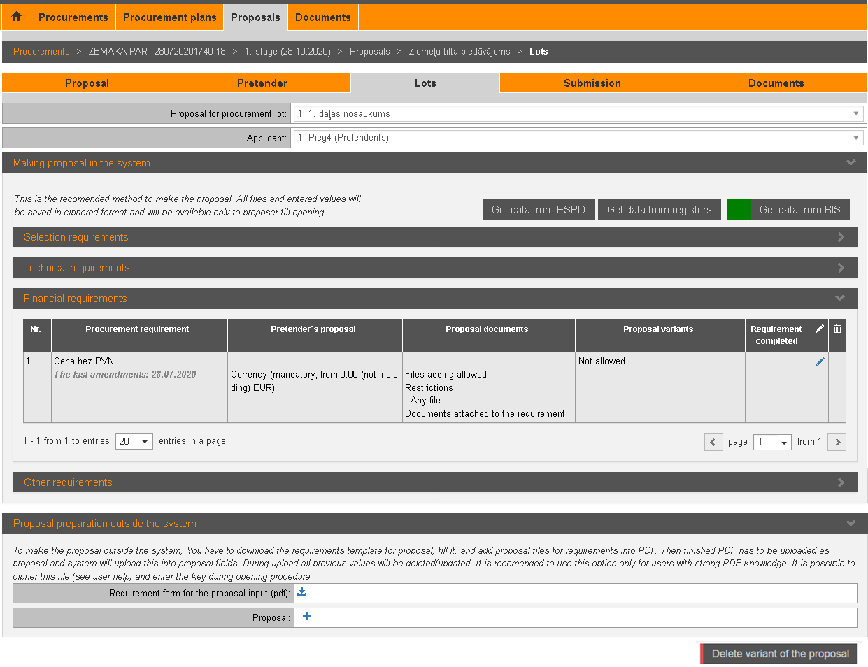 − Download the requirement form in .pdf, fill in it and attach to proposal – system automatically fills in the requirement form in a system with correctly entered data in .pdf file.