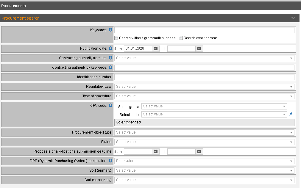 When selecting procurements by Contracting authority, it can be selected from the list in the field Contracting authority from the list or entering the text in the field Contracting authority by keywords – in that case procurements where Contracting authority name contains all entered words will be selected. |