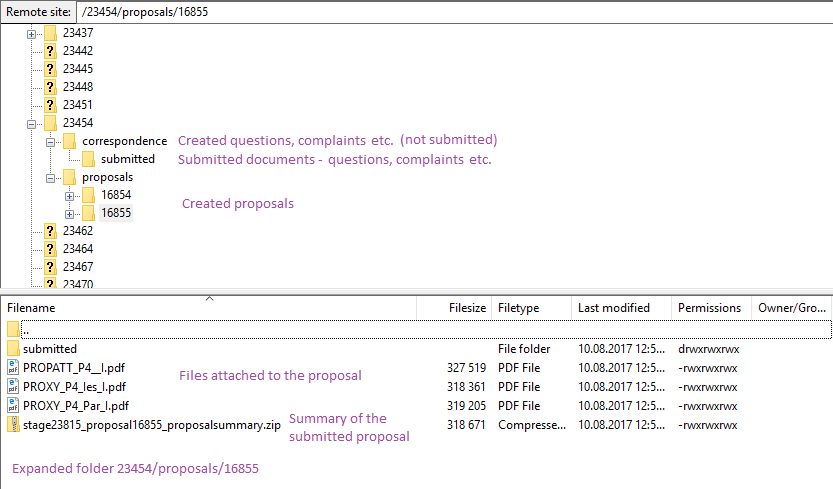 − Procurement_ID folder – the folder is created when users of the organization create the proposal or question. The corresponding subfolders Correspondence and Proposal are created as well. Different proposal documents, for example, final proposal (generated .zip) and other documents are stored in the folders. This folder available for pretender’s users using the FTP client. Files are only available for download, you cannot edit, delete, or upload them. You can open this folder directly by clicking on the hyperlink at the field Proposal data in EPS FTP server in the procurement basic data form.