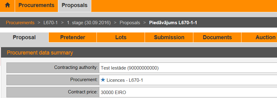 − „Proposal” – procurement summary and all pretender’s proposals, operation to create new proposal (see 15.5 Summary data of the proposal).