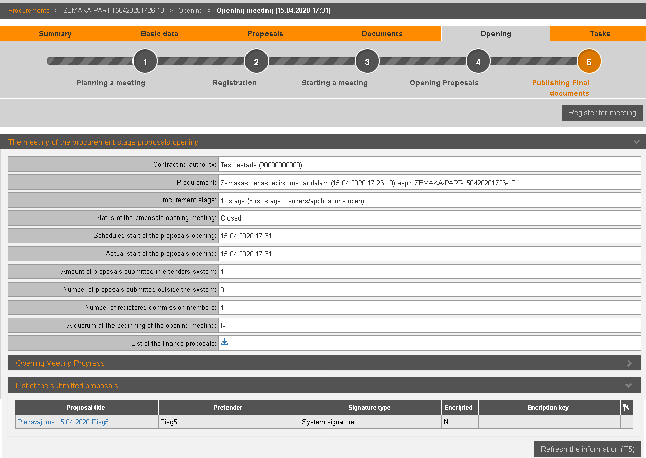 After registration for meeting, pretender can view proposal opening meeting’s information and summary of submitted proposals.
