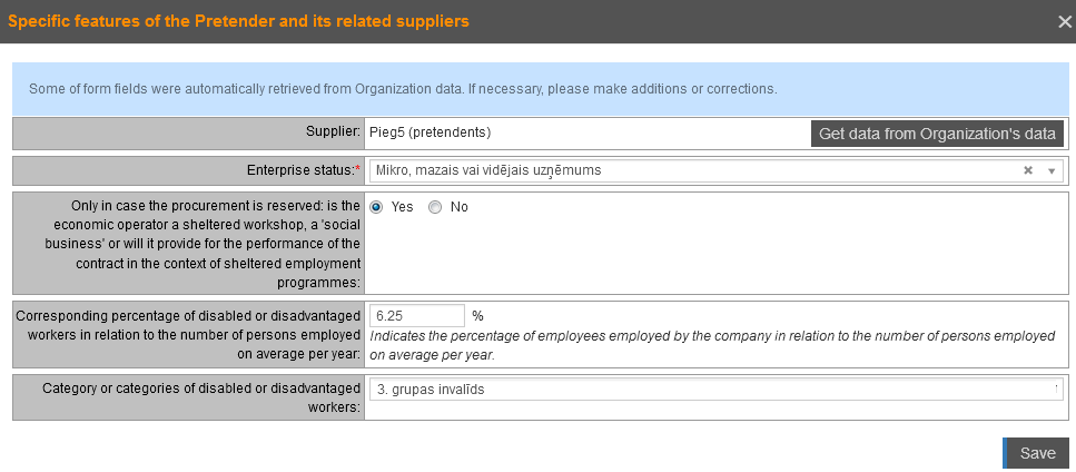Information about the pretender’s specific features and enterprise status can be get from the data recorded in the Organization information in EPS by clicking the Get data from Organization data button – the special feature information already entered are overwritten with the information from the organization's data.
