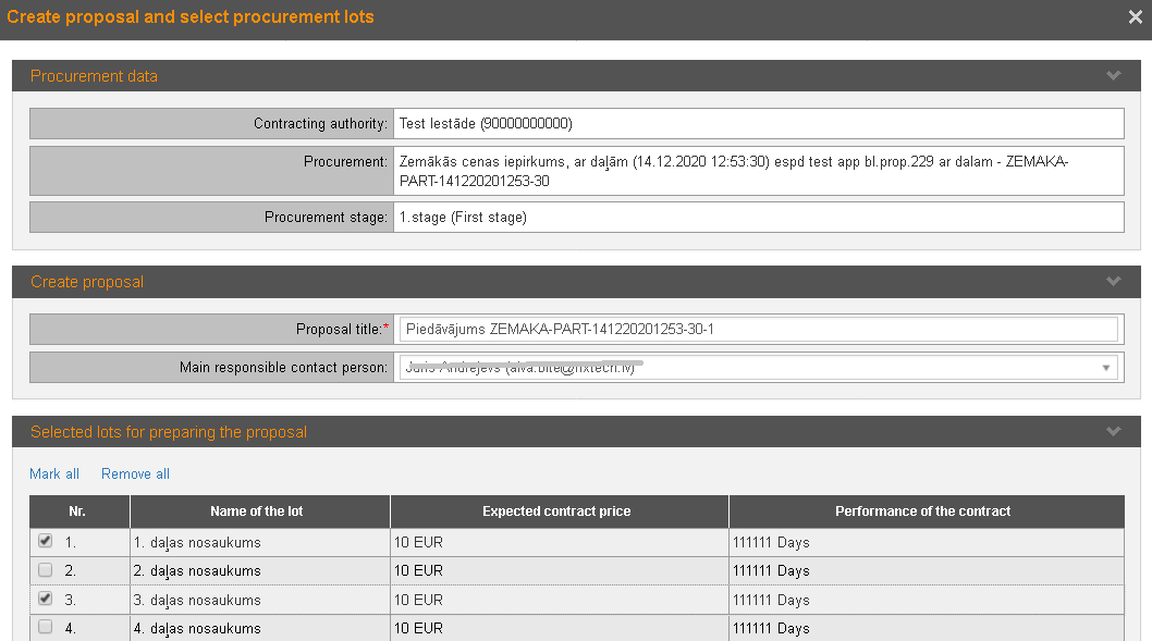 To start the preparation of the proposal, in the procurement form „Basic data” click the button Create proposal – the form opens where lots can be selected.