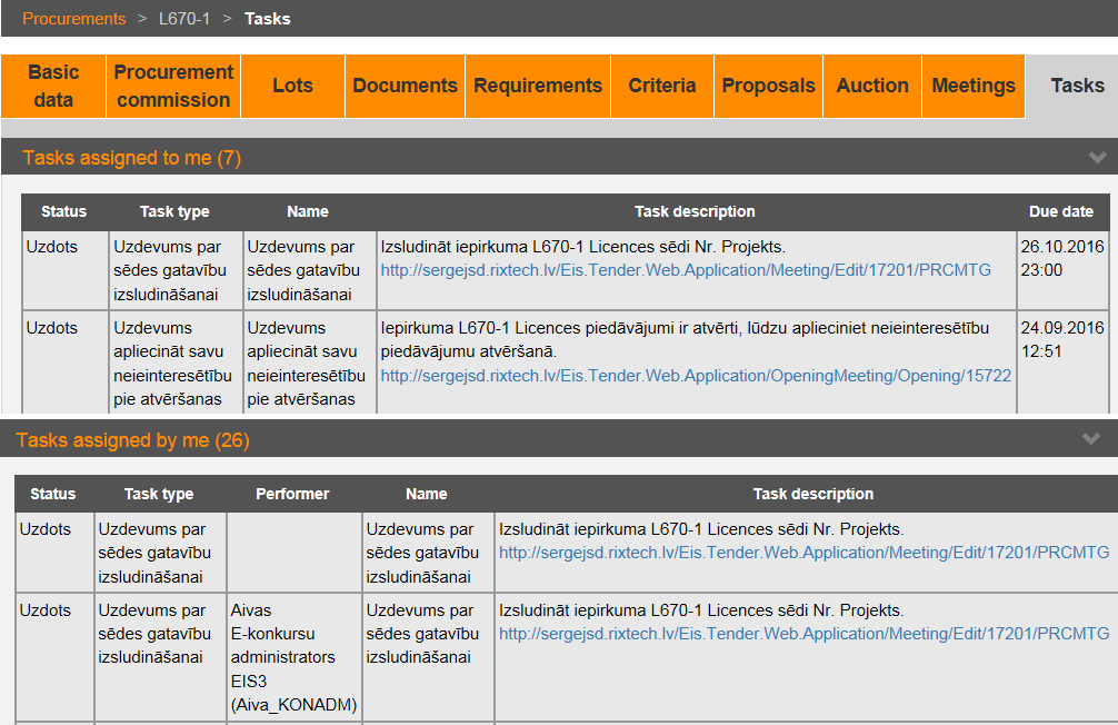 In the procurement section „Tasks” all tasks assigned to user as well as tasks assigned by user are available.