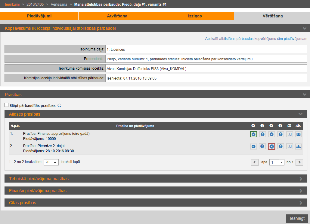 Katrs IK dalībnieks var ievadīt savu individuālo atbilstības vērtējumu katram piedāvājumam katrai prasībai. Lai ievadītu atbilstības pārbaudi: