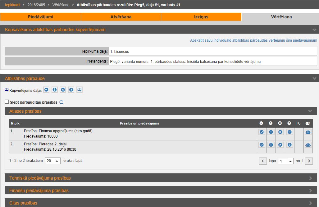 gala lēmumu par piedāvājumu atbilstību, šķirklī “Vērtēšana” uzklikšķina