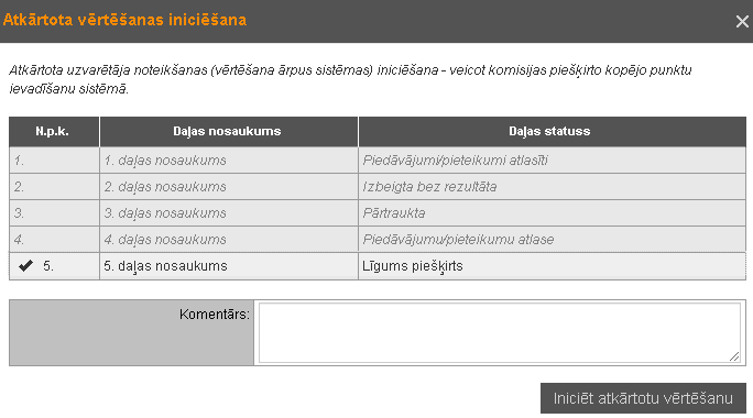 Atzīmē iepirkuma daļu un uzklikšķina pogai Iniciēt atkārtotu vērtēšanu – daļas statuss kļūst ‘Uzvarētāju noteikšana’ un tai veicams atkārtots vērtēšanas process, sākot ar punktu ievadi.