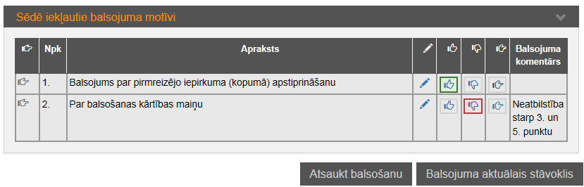 Sēdes dalībnieki iepirkuma sadaļā „Sēdes”, izsludināto sēžu sarakstā atver sēdes formu, izvēlas balsojuma motīvu un, izmantojot ikonas pie katra balsojuma motīva, atzīmē tam balsojumu ‘Par’, ‘Pret’ vai ‘Atturēties’.