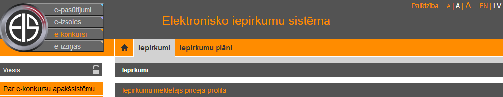 Attēls 1. E-konkursu apakšsistēmas galvenā izvēlne anonīmam lietotājam
