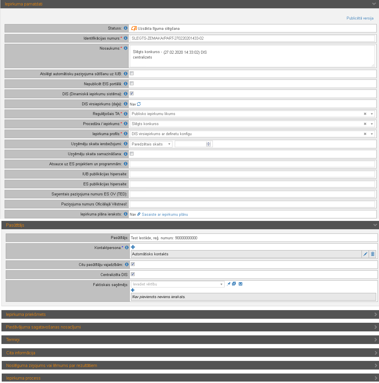 Iepirkuma identifikators, nosaukums, normatīvo aktu un regulējumu informācija. DIS (Dinamiskā iepirkuma sistēma) – pazīme, ka iepirkums ir DIS iepirkums. Atzīmē gan virsiepirkumiem, gan iepirkumiem DPS ietvaros. DIS virsiepirkums (daļa) – iepirkumiem DIS ietvaros piesaista virsiepirkumu vai tā daļu (sk. 29.4 DIS virsiepirkuma piesasaiste). |