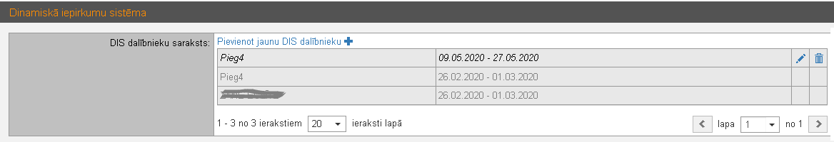 DIS dalībnieku saraksts – plānotie, aktīvie un vēsturiskie DIS iepirkuma dalībnieki. Lai pievienotu jaunu dalībnieku, uzklikšķina hipersaitei Pievienot jaunu DIS dalībnieku (sk. 29.3 DIS dalībnieku administrēšana). Bloku attēlo sākot no iepirkuma statusa ‘Uzsākta līguma slēgšana’ iepirkuma daļas datos vai virsiepirkuma pamatdatos, ja iepirkums nav sadalīts daļās. |