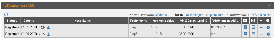 Attēls 272. DIS pieteikumi sadaļā “Dokumenti”