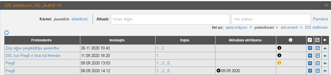 − Dokumenti – iepirkuma sadaļa “Dokumenti” bloks “DIS pieteikumi” (sk. 5.17 DIS pieteikumi).