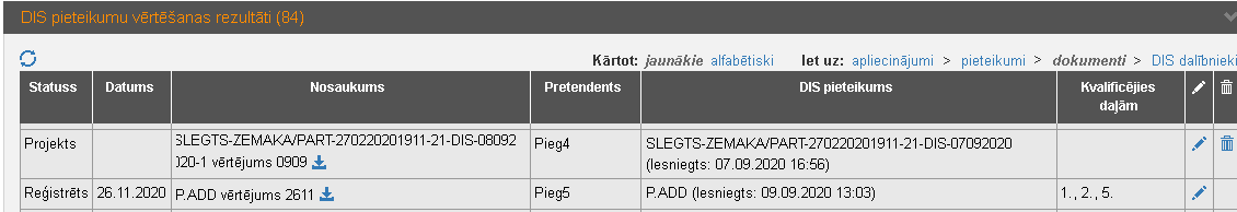 Kārtošanas un navigācijas iespēju aprakstu sk. 29.7 DIS pieteikumu vērtēšana.