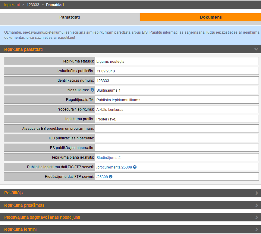 Attēls 265. EIS publikācijas iepirkuma pamatinformācija