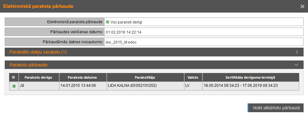 Ja pārbaude pabeigta, tiek atvērta forma e-paraksta pārbaudes rezultāta apskatei: