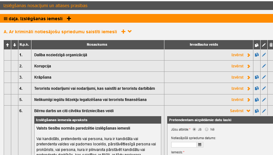 − ESPD veidnei var pievienot tikai ESPD izslēgšanas nosacījumu un atlases prasības.