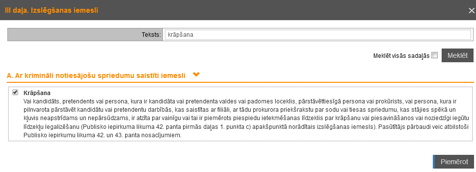 Attēls 55. ESPD prasību atlase un piemērošana