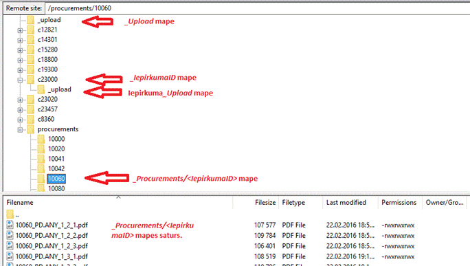 − Iepirkuma_Upload mape – lietotāji var augšupielādēt nepieciešamās ar konkrēto iepirkumu saistītās lielās datnes. Mape no FTP puses pieejama tikai tiem lietotājiem, kas ir šī iepirkuma komisijā. Lielākajā daļā gadījumu no sistēmas atverot datnes augšupielādes formu un izvēloties darbību ‘Pievienot no repozitorija’, var izvēlēties datnes no šīs mapes. Piemēram, Iepirkuma prasību dokumentus.