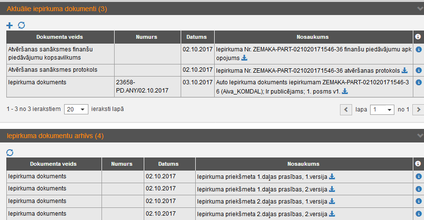 Iepirkuma vai piedāvājuma sadaļā „Dokumenti – Aktuālie iepirkuma dokumenti” tiek attēloti: