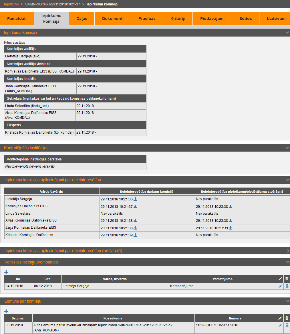 Lai lietotājam būtu pieejama iepirkuma informācija un darbības ar to, lietotājam jābūt pievienotam iepirkuma komisijai.