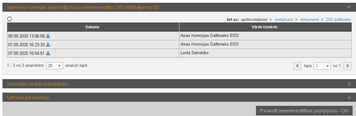 Ja DIS iepirkumā statusā ‘Nodibināts DIS’ pievieno komisijas locekļus (izņemot IUB eskspertu), sistēma nosūta paziņojumu par nepieciešamību parakstīt vismaz vienu paziņojumu par neieinteresētību DIS pieteikumos. |