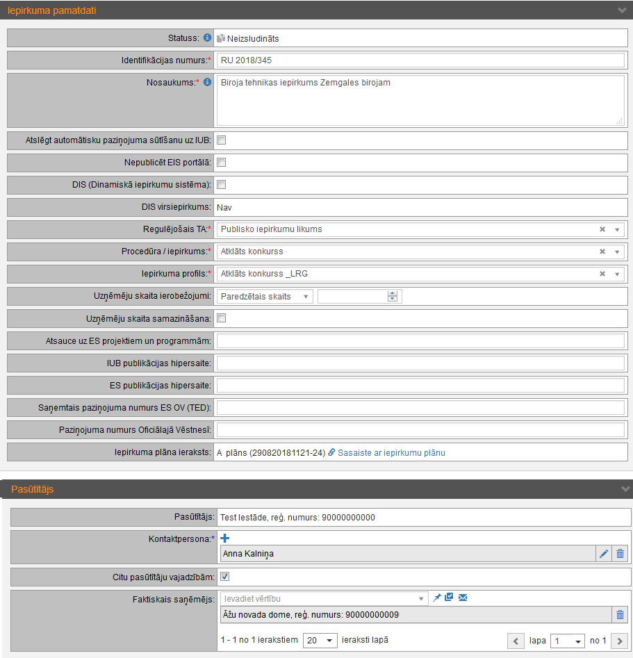 Veidojot jaunu iepirkumu, norāda informāciju datu blokos „Iepirkuma pamatdati” un „Pasūtītājs”.