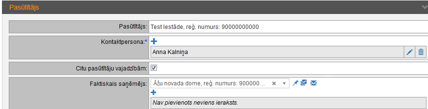Informācija par iepirkuma organizētāju, pasūtītāju, kontaktpersonu un faktisko saņēmēju, ja tas atšķiras no pasūtītāja. Ja iepirkums tiek veikts citu pasūtītāju vajadzībām, atzīmē atbilstošo izvēles rūtiņu. Laukā Faktiskais saņēmējs norāda vienu vai vairākus faktiskos saņēmējus vienā no veidiem: − Izvēlas no