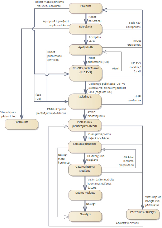 Iepirkuma identifikators, nosaukums, normatīvo aktu un regulējumu informācija. Ja iepirkumam piemērojamas ESPD Izslēgšanas nosacījumu un atlases prasības, jāizvēlas Iepirkuma profils, kas paredz šādas prasības. Ja iepirkums paredzēts kā mazais iepirkums ar vienkāršotu norises procesu (sk. 27 Mazie iepirkumi – pasūtītājam), jāizvēlas atbilstošs Iepirkuma profils. Ja iepirkums ir metu konkurss (sk. 31 Metu konkursi – pasūtītājam), jāizvēlas atbilstošs Iepirkuma profils (sk. metu konkursu aprakstu 31. Metu konkursi – pasūtītājam). Metu konkursu devīzes statuss attēlots laukā Devīzes. Iepirkums var būt šādos statusos: − Neizsludināts – iepirkums tiek gatavots, vai arī statuss pēc grozījumu iniciēšanas. − Balsošanā – iepirkums ir nodots izskatīšanai sēdē. − Apstiprināts – iepirkums ir izskatīts sēdē un apstiprināts. − Nosūtīts publicēšanai – iepirkuma posms, kuram paredzēta publicēšana arī IUB, ir nosūtīts publicēšanai. − Izsludināts/Publicēts – iepirkuma posms ir publicēts. − Pieteikumi / piedāvājumi atvērti – piedāvājumi ir atvērti, notiek vērtēšana. − Lēmums pieņemts – pēc vērtēšanas, ja visu daļu statusi ir ‘Līgums piešķirts’ vai ‘Pārtraukta, vai ‘Izbeigta bez rezultāta’. − Uzsākta līguma slēgšana – pēc lēmuma pieņemšanas konfigurācijā noteiktajā laikā IUB nav saņemtas sūdzības, un var uzsākt līguma slēgšanu. − Līgums noslēgts – noslēgts līgums par visām iepirkuma daļām, kuras nav pārtrauktas vai izbeigtas bez rezultāta. − Noslēgts – iepirkums ir noslēgts. − Izbeigts – visas iepirkuma daļas ir izbeigtas vai pārtrauktas, iepirkums ir izbeigts. − Pārtraukts – iepirkums ir pārtraukts. − Arhivēts. Lai norādītu iepirkuma sasaisti ar iepriekšējo