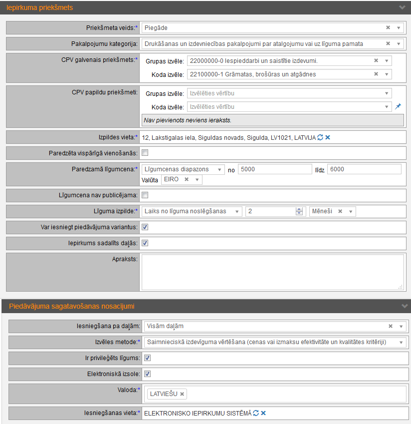 Informācija, vai piedāvājumu var iesniegt pa daļām, iepirkuma uzvarētāja izvēles metode, piedāvājumu iesniegšanas vieta – pēc noklusējuma ‘Elektronisko iepirkumu sistēma’. Metu konkursiem Izvēles metode paredzēta tikai ‘Saimnieciski izdevīgākais piedāvājums’, tādēļ šis lauks vispār netiek attēlots. Ja iepirkumā paredzēta elektroniskā izsole, atzīmē izvēles rūtiņu Elektroniskā izsole. Lauks Priviliģēts līgums pieejams, ja iepirkumā paredzēts piemērot ESPD izslēgšanas un atlases prasības. |