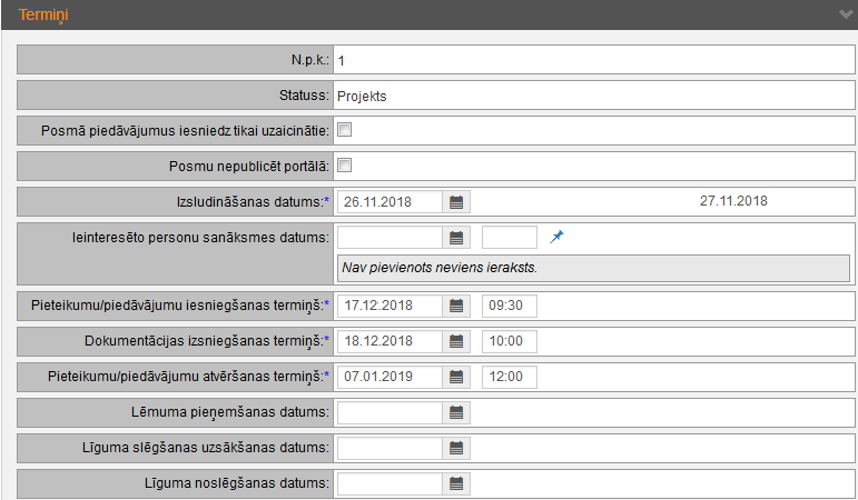 Datumi un laiki soļiem iepirkuma procesā. Sk. bloka “Termiņi” aprakstu. Uzklikšķinot ikonai |