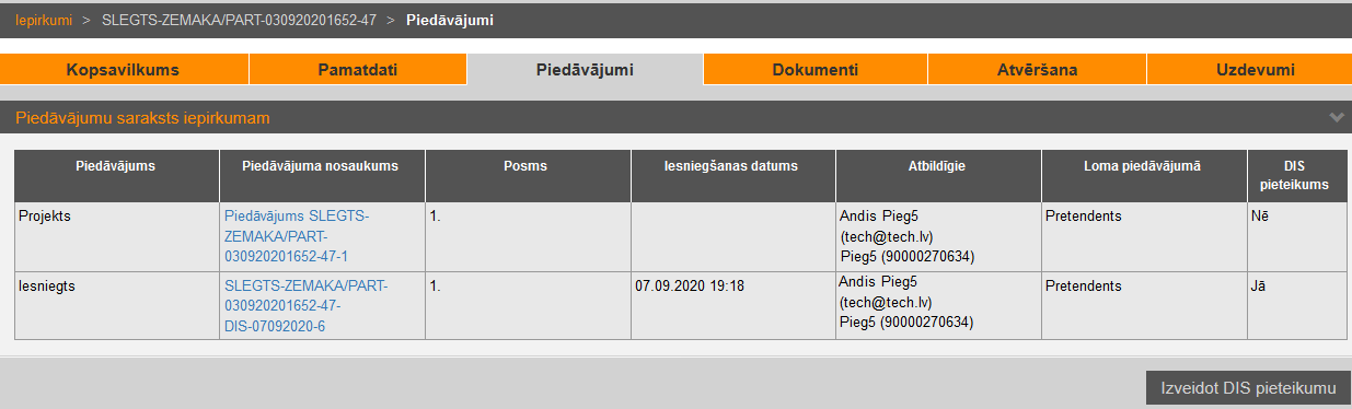 Iepirkuma sadaļā „Piedāvājumi” saraksta veidā attēloti pretendenta piedāvājumi, kurus pretendents sagatavojis kā piedāvājuma iesniedzējs, apakšuzņēmējs, personu grupas dalībnieks vai kā persona, uz kuru balstās.