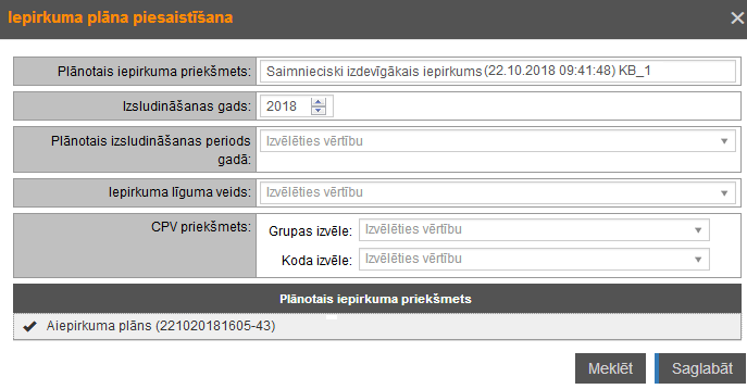 Piezīme! Sasaistot iepirkuma plānu ar iepirkumu, sistēma nepārbauda CPV kodu, iepirkuma priekšmeta, procedūras atbilstību.