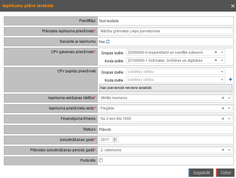 Iepirkuma priekšmets, CPV kods, plānotais izsludināšanas gads, statuss un cita informācija. Norādot plānoto izsludināšanas periodu gadā, izvēlas mēnesi vai ceturksni. Iepirkuma plāna ieraksts var būt šādos statusos: − Plānots – iepirkums ir plānots. − Izsludināts – atbilstošais iepirkums ir izsludināts. − Piedāvājumi atvērti – atbilstošā iepirkuma piedāvājumi ir atvērti, notiek vērtēšana. − Lēmums pieņemts – atbilstošajā iepirkumā pieņemts lēmums par uzvarētāju. − Līgums noslēgts – atbilstošajā iepirkumā līgums ir noslēgts. − Izbeigts – atbilstošais iepirkums ir izbeigts. − Pārtraukts – – atbilstošais iepirkums ir pārtraukts. Ja iepirkuma plāna ieraksts nav piesaistīts iepirkumam vai tas piesaistīts iepirkumam, kas nav reģistrēts EIS, tam statusu var mainīt manuāli. Piesaistot plāna ierakstu iepirkumam sistēmā, plāna ieraksta statuss mainās automātiski, mainoties iepirkuma statusam. Lai norādītu iepirkuma plāna sasaisti ar iepirkumu,