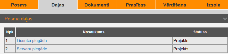 Attēls 49. Iepirkuma posma daļu saraksts